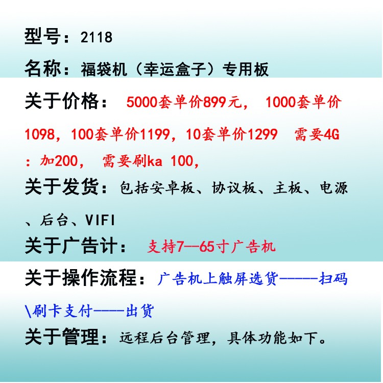 宇脉MCU单片机厂家,主控设备自助研发生产,自助福袋机控制器主板,联网多功能自助设备,支持定制开发,真正拥有自己的研发团队。自助福袋机主控板,小区、商场、厂区自助福袋机、售货机、饮料机,一个主板可以支持80个货道,支持WIFI+4G通讯,自主选择,广告机点击出货,多种支付方式如:刷卡、微信、支付宝等方式,宇脉厂家自主研发的自助系统,系统会不定期的升级, 提供免费升级功能,让您的设备不落后于时代,社会在进步, 我们也在进步。我们坚守着“只有客户好,公司才能发展得更好”的理念,只要您相信我们,我们愿与您共同成就更好的未来,共同成长,共同发展,携手打造一体化智能智慧社区。社区一卡通,让您拥有大数据管理!
